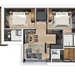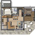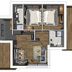 Inredningen inkluderar soffa samt satellit-TV. I badrummet finns även en separat toalett, ett badkar och en dusch. Hårtorkar, toalettartiklar och badrockar ingår för extra komfort.
